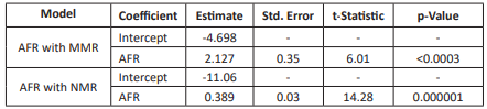 Table 1: Regression Analysis Coefficients and Statistical Significance for Adolescent Fertility Rate (AFR) Relationships with Maternal Mortality Ratio (MMR) and Neonatal Mortality Rate (NMR)