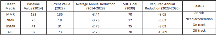 Reduction Rates (AARR) and Progress: Table 2 shows AARR for 2014-2023: MMR (-3.44%), NMR (-3.23%), U5MR (-2.75%), AFR (-2.28%). The required AARR for 2023-2030 are MMR (-9.05%), NMR (-5.63%), U5MR (-3.03%), AFR (-16.89%), with statuses: MMR (At risk), NMR (Need acceleration), U5MR (On track), AFR (Off track).