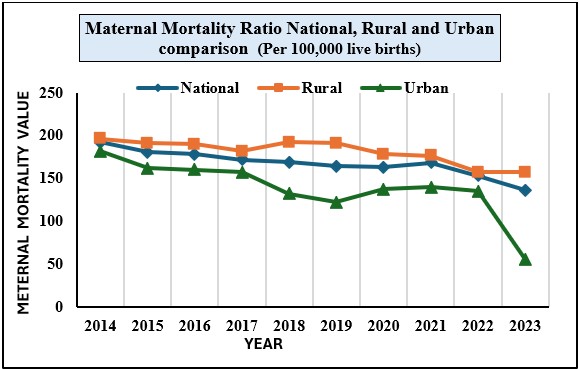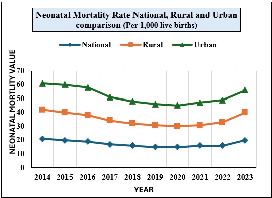 Neonatal Mortality Rate: The graph shows a consistent decline in neonatal mortality rates across all categories from 2014 to 2023. National rates fell from 21 to 20 per 1,000 live births, urban areas achieved the lowest rates (19 in 2014 to 16 in 2023), and rural areas lagged behind (21 to 17). The rural-urban gap persisted, with rural rates typically 3–5 points higher.