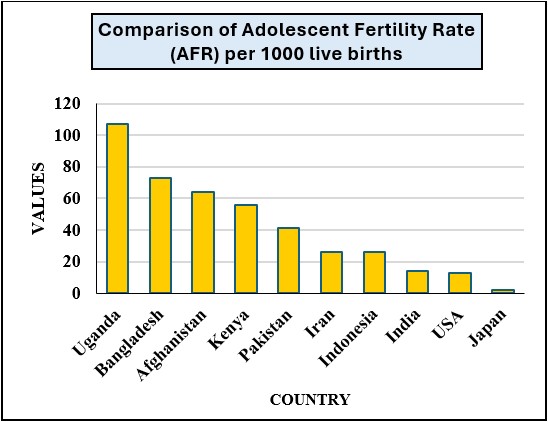 Comparative Analysis of Adolescent Fertility Rate: Bangladesh’s AFR (73) improved from 92 (2014) but remains high compared to India (14) and the USA (13).