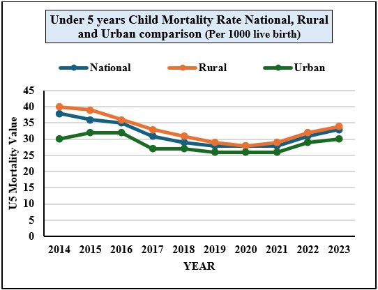 Under Five Child Mortality Rate: The under-5 mortality rate (U5MR) declined steadily from 38 to 28 deaths per 1,000 live births between 2014 and 2021. However, an uptick to 31 in 2022 and 33 in 2023 raises concerns, potentially linked to pandemic-related healthcare disruptions, infectious disease outbreaks, or gaps in postnatal care continuity.