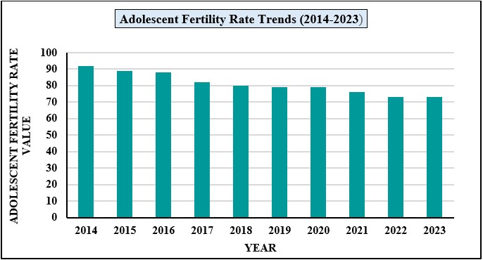 Adolescent Fertility Rate: The Adolescent Fertility Rate (AFR) decreased from 92 to 73 births per 1,000 women aged 15-19 between 2014 and 2023, marking a 20.6% reduction over the decade, driven by expanded access to sex education, contraception, policies promoting girls’ education, delayed marriage, and awareness campaigns on teen pregnancy risks.