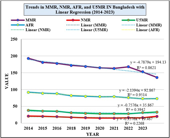 Figure 5: Trends in MMR, NMR, AFR, and U5MR In Bangladesh with Linear Regression (2014-2023)