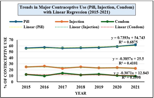 Figure 6: Trends in Major Contraceptive Use (Pill, Injection, Condom) with Linear Regression (2015-2021)
