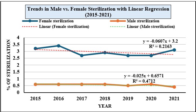 Figure 7: Trends in Male and Female sterilization percentage with Linear Regression (2015-2021)