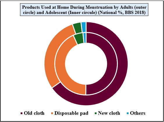 Products Used at Home During Menstruation by Age Group: The 2018 Bangladesh National Hygiene Survey showed 64% of adults and 50% of adolescents using old clothes, while 43% of adolescents and 29% of adults used disposable pads, with low use of new cloth and other alternatives.