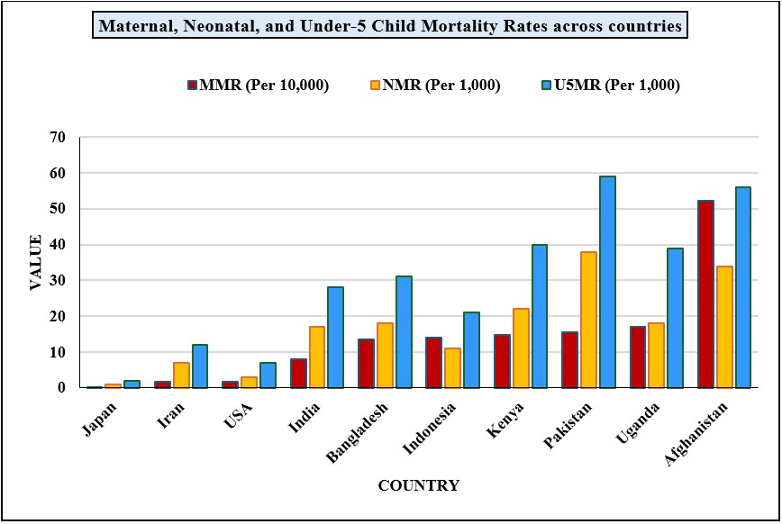Figure 9: Comparative Analysis of Maternal, Neonatal, and Under-5 Child Mortality Rates in Selected Countries
