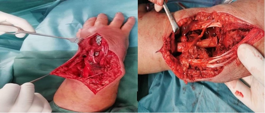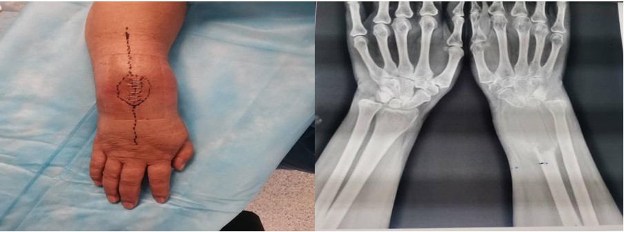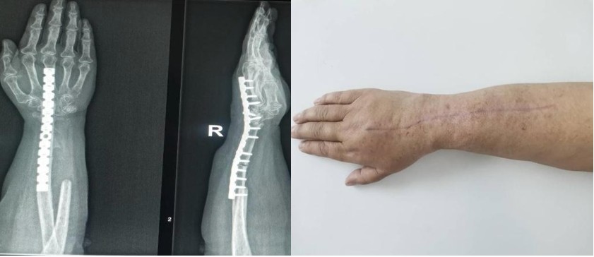The tumor bed treated with hydrogen peroxide 3% solution to sanitize the wound for microscopic tumor cell spillage, around 8 cm of distal ulna was resected, keeping intact all soft tissue attachments and centralized between the lunate and radius cut end , articular surfaces of distal ulna and lunate were removed with burr for arthrodesis and it was stabilized with reconstructed pre-contoured 3.5mm plate across wrist ovar the 3rd metacarpal bone.