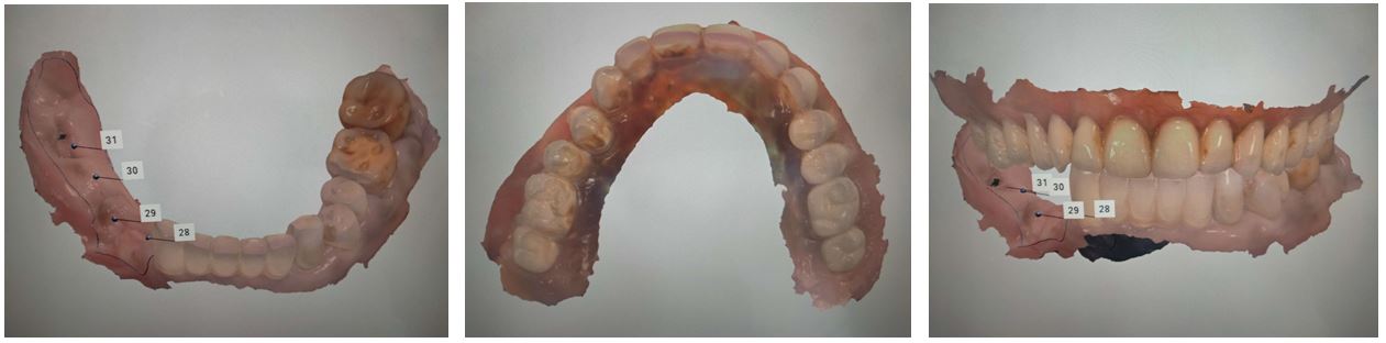 The image of oral soft tissue was not captured by the scanning head, and the scanning procedure was suspended if the mucosal surface was overdried. Thirdly, the scanning head should be parallel to the surfaces of the scanned objects and be kept a certain distance when the smooth and shiny surfaces, such as the surfaces of ceramic and metal prosthesis and worn teeth, were scanned. Clinging to the surfaces of the objects should be avoided. Fourthly, the mouth mirror and the saliva ejector were used to appropriately pull and push soft tissues, including lips, tongue, buccal tissue, and mouth floor, to imitate muscle functional trimming when the mucogingival junction area was scanned. The oral frenum and the mucosal area outside the mucogingival junction should be included in the scanning range. The image of the frenum configuration, the light pink attached gingiva and red mucosa was clearly displayed on the screen, the prosthodontist or the dental technician was convenient to modify the impression image. Lastly, data of partial dentition needed to be acquired in most fixed restoration, and the scanning difficulty was low. However, data of soft and hard tissues of the whole dentition relevant to RPDs should be acquired in this study. Therefore, a reasonable order should be followed when scanning, in order to efficiently acquire image data of oral tissues and avoid missing data.