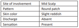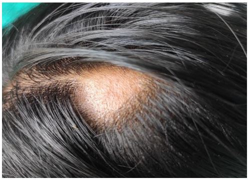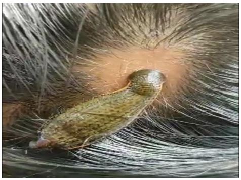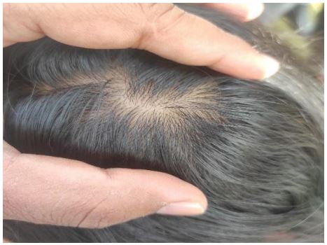 Disease Specific Examinations:- Examination showed patchy hair loss measuring about 4x4 cm on mid scalp region and mild dryness over patch, no scarring or cicatrization, nor any other skin lesion over scalp, no tumor in localized area and abnormalities of hair in adjacent area. Length of hair of adjacent scalp was uniform and was not broken off. The patient was clinically diagnosed as case of Indralupta (Alopecia areata) and advised for Leech therapy.