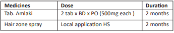 Primary management of Indra lupta (Alopecia areata patchy) is shodhan therapy (Detoxification). As per Ayurvedic literature application of Jalauka (Leeches) on diseased area is a type of Raktamokshan (blood-letting) under Panchakarma Chikitsa. Blood vitiated by Pitta should be removed from the body (Diseased part) by using Jalauka. Leech Therapy (Jalauka) was done once a week along with internal and local medications up to 2 month. (Table-1, 2). Application of Jalauka (Leech) was done as per methodology described by Ayurved text with all aseptic precautions. The follow up was taken once in a week.